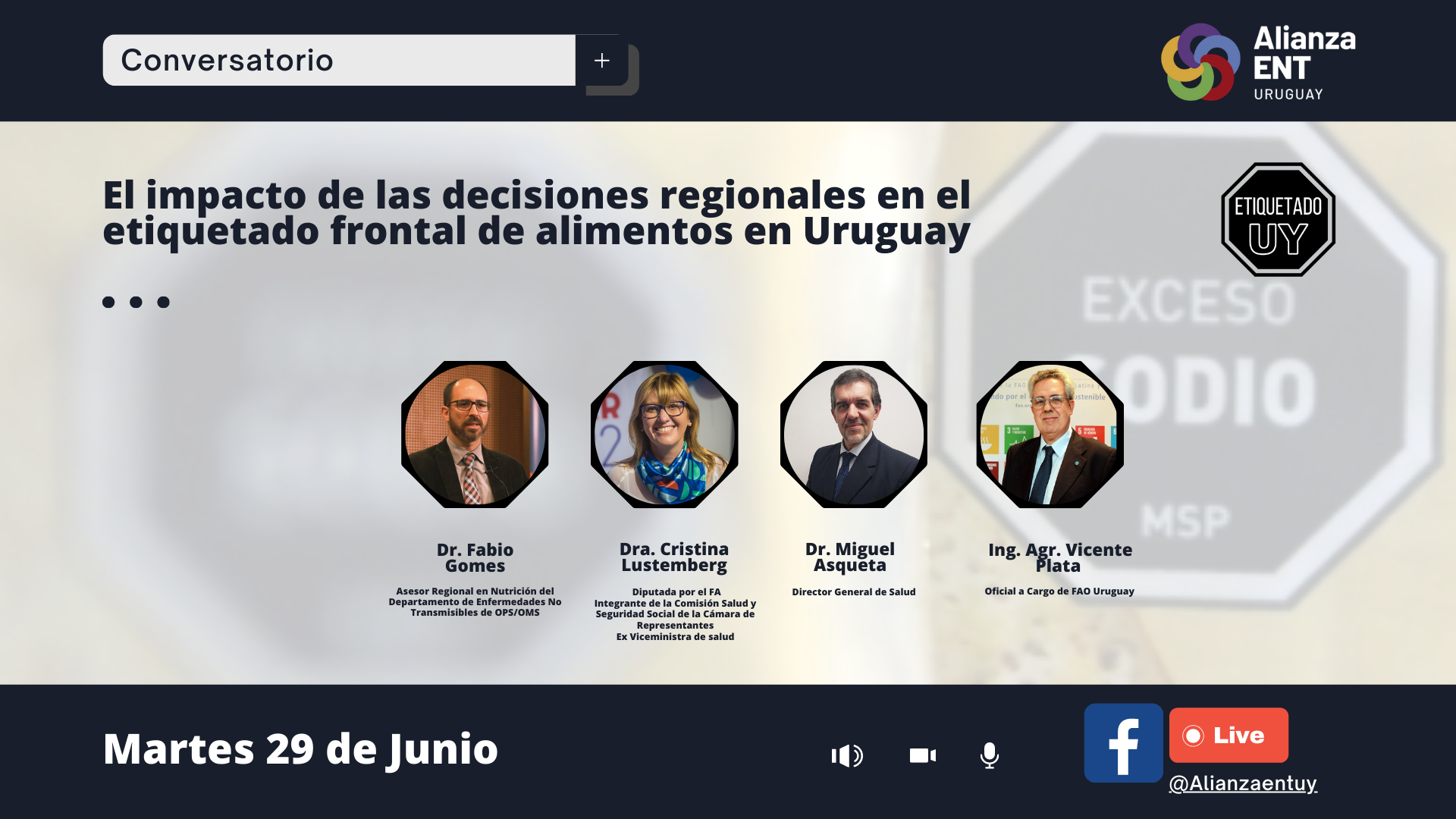 Contamos con la presencia del Dr. Fabio Gomes, asesor regional en nutrición del departamento de enfermedades no transmisibles de OPS/OMS, el Dr. Miguel Asqueta, Director General de Salud, la Dra. Cristina Lustemberg, Diputada, integrante de la comisión Salud de la cámara de Representantes, y con el Ing. Agr. Vicente Plata, Oficial a cargo de FAO Uruguay.